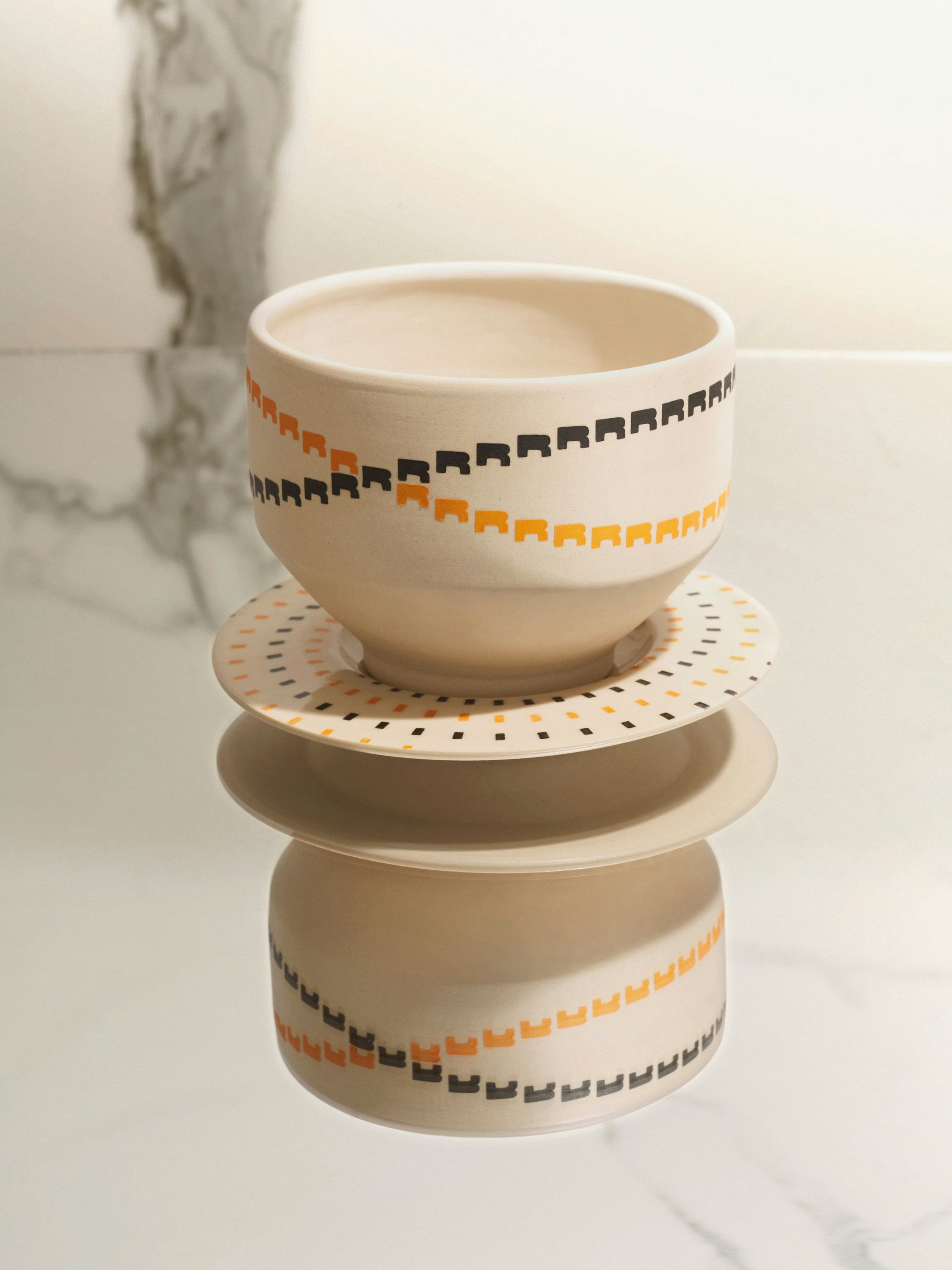 Potter Kenny Sing worked on the Rarible teacup and saucer set. Sing often merges tech and art and likes that his work can be experienced both physically (as a usable, handheld cup) and digitally (as pictures and videos). He runs turn.studio and many of his works feature animation which he crafts with the help of software. The block imagery on the saucer and the chain shape of the animation are a nod to the blockchain technology behind NFTs.