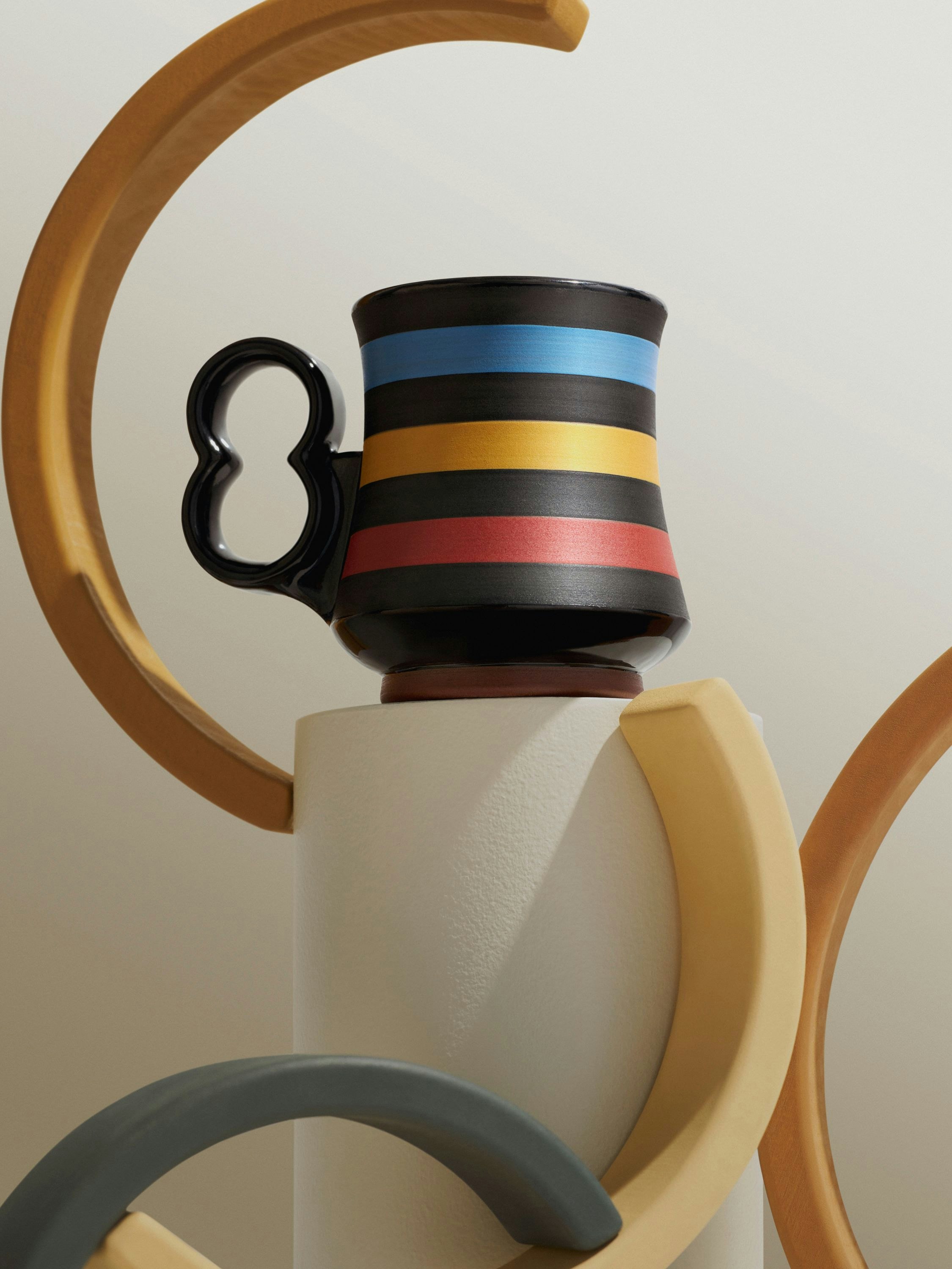 Potter Eric Van Eimeren’s teacup shows the Runway logo — a natural fit because his pottery often involves bright colorblock — and features his signature, two-finger handle (which he continues to improve on). His inspiration comes from his father, an artist whose postmodern paintings were very “clean,” “geometric,” and “sculptural.” When asked if he considers himself a founder, he says that “this, for me, really came out of personal enjoyment. I had to find a way to keep doing it and to generate enough income from it, so that I could quit my other job.”