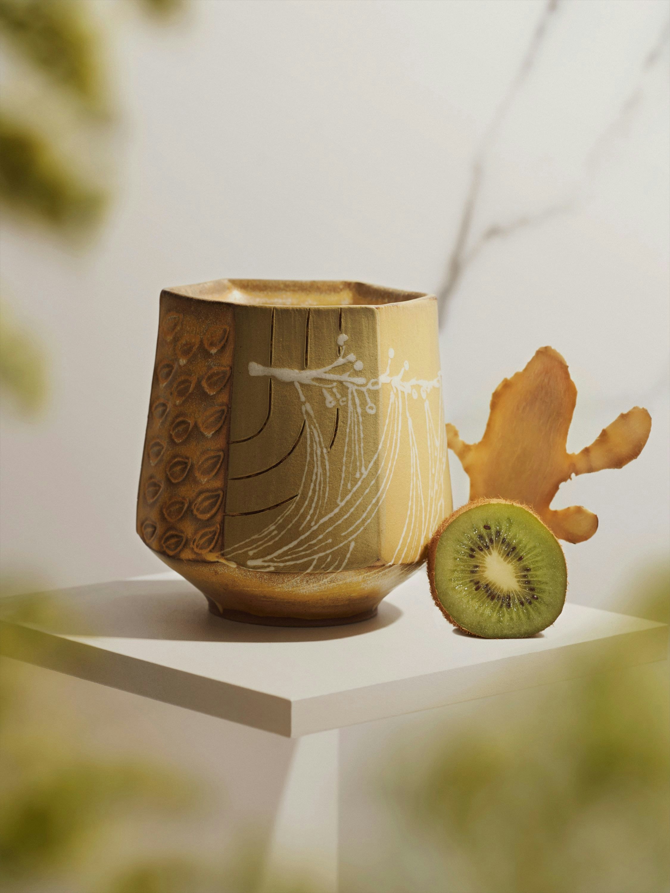 Eco-friendly potter Amanda Bury completed the tea cup for Terraformation, using a mixture of both wild and reclaimed clay (versus synthetic or unrecycled.) She incorporated an illustration of Acacia Koaia, one of the plants that Terraformation grows on their pilot site in Hawaii, on her Yunomi style tea cup. Amanda’s love of pottery comes from her love of food, which she considers the primordial source of connection between humans and the environment.